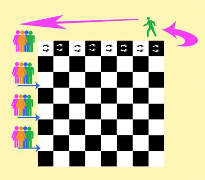 Once a child reaches the other side they should leave the chessboard and go to the back of their line, going around outside the chessboard