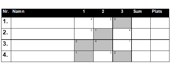 Enter the names of the participants in the tournament under the heading Names. The small number inside the round windows shows who you meet, and what colour you are. If the small number on the right in the round box is the player is white, if the small number on the left is the player is black (grey box). In the first round, No. 1 is white against No. 4 and No. 2 is white against No. 3. It is good if the tournament leader reads out who meets before each round and then clarifies who is white and who is black.